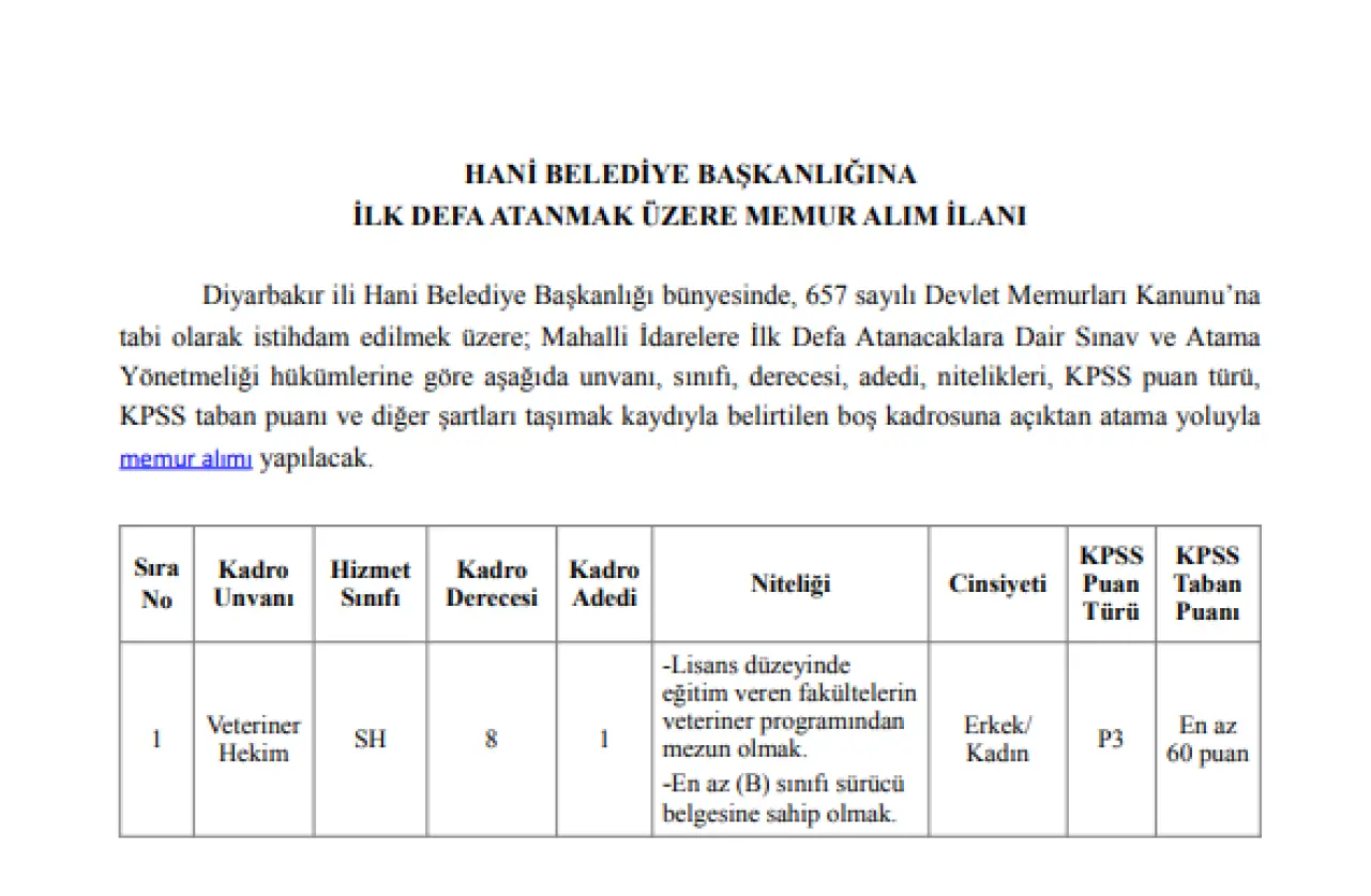 Hani Belediyesi tarafından açılan bu kadro, özellikle veteriner hekimlik mezunları için önemli bir kamu istihdam fırsatı sunuyor. Sınırlı kontenjan ve yüksek maaş avantajı nedeniyle ilana yoğun başvuru yapılması bekleniyor.