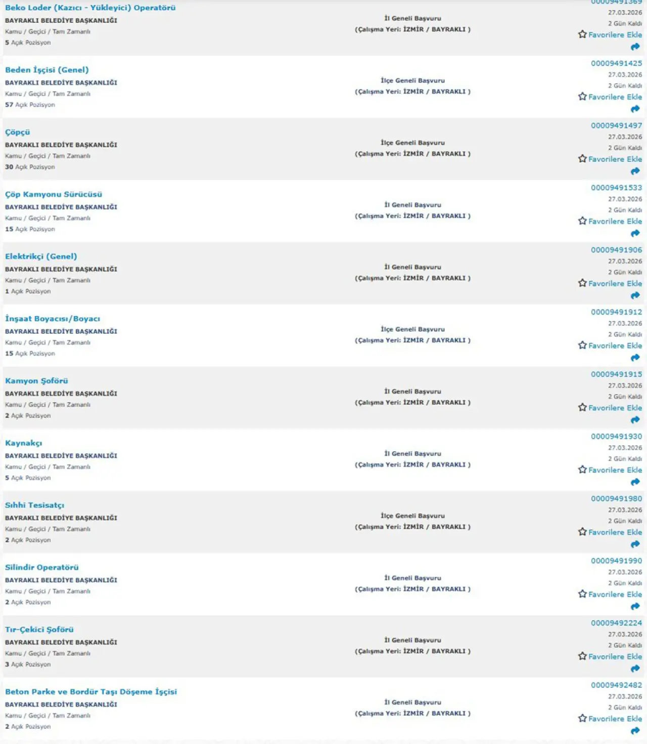 Bayraklı Belediyesi tarafından yayımlanan ilana göre toplam 12 farklı meslek grubunda işçi alımı yapılacak. Kadro dağılımı ise şu şekilde:
