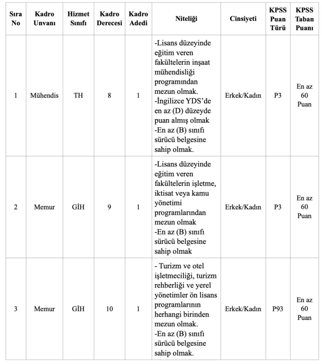 Yayımlanan ilana göre alımlar; teknik ve idari kadroları kapsarken, başvuru süreci, sınav aşamaları ve değerlendirme kriterleri de net şekilde açıklandı. Özellikle KPSS puanı ile başvuru yapılacak olması nedeniyle ilan, kamuya atanmak isteyen adaylar arasında büyük ilgi görmesi beklenen duyurular arasında yer alıyor.