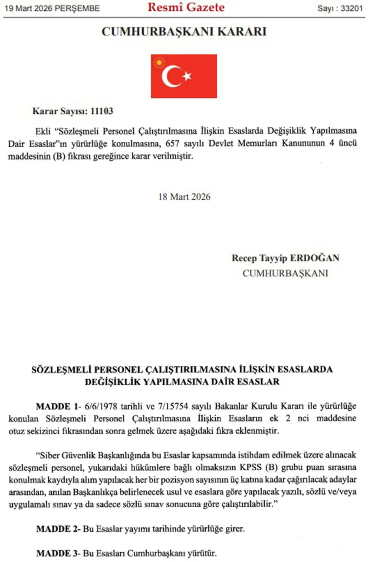 Kamu personel alımlarını yakından takip eden milyonlarca aday için önemli bir gelişme yaşandı. 19 Mart 2026 tarihli ve 33201 sayılı Resmi Gazete’de yayımlanan Cumhurbaşkanı Kararı ile kamuya sözleşmeli personel alımı sisteminde yeni düzenleme yürürlüğe girdi.