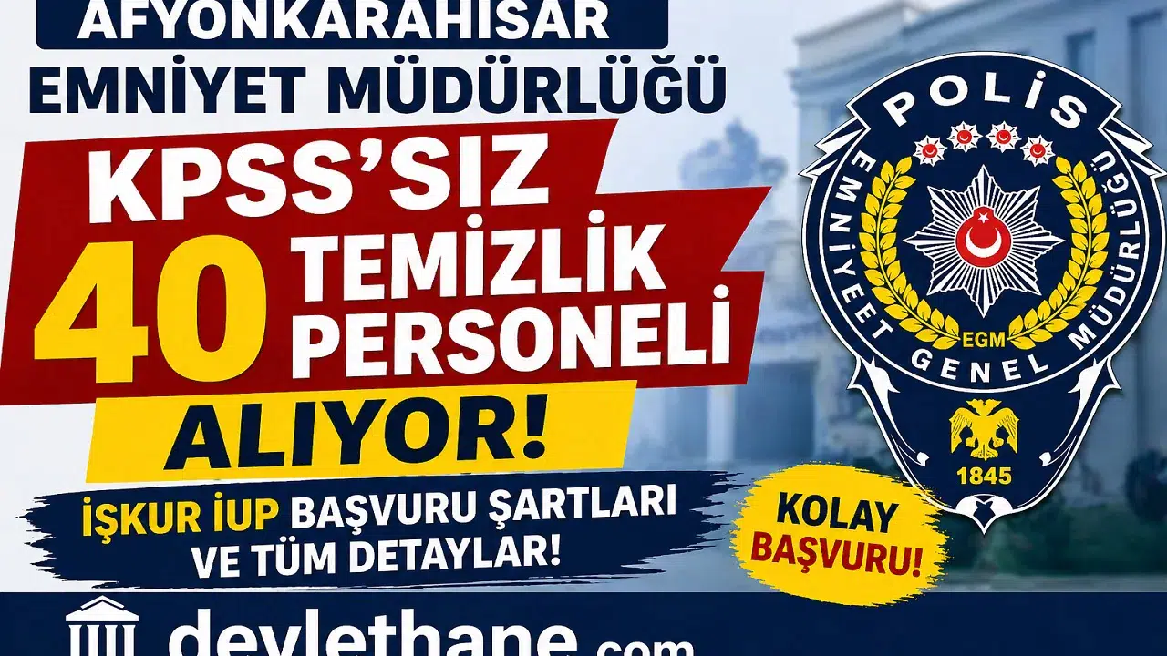 Afyonkarahisar İl Emniyet Müdürlüğü personel alımı 2026 yılı için dikkat çeken bir ilan yayımlandı. İŞKUR üzerinden duyurulan bu ilan kapsamında, KPSS şartı olmadan 40 temizlik personeli alımı yapılacağı açıklandı. Özellikle KPSS’siz işçi alımı 2026, İŞKUR İUP personel alımı, emniyet temizlik görevlisi alımı gibi aramalar yapan adaylar için önemli bir fırsat sunuluyor.