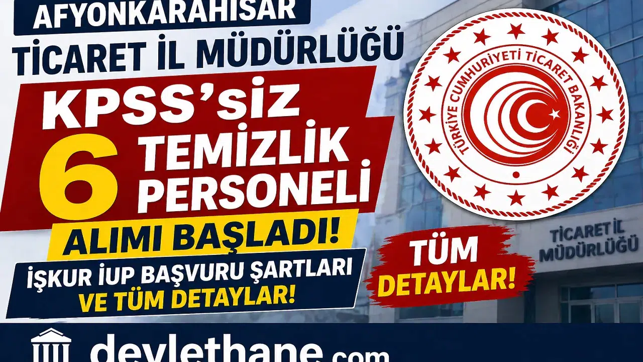 Afyonkarahisar’da kamu iş arayanlar için yeni bir fırsat daha duyuruldu. Afyonkarahisar Ticaret İl Müdürlüğü, İŞKUR İşgücü Uyum Programı (İUP) kapsamında KPSS şartı olmadan 6 temizlik personeli alımı yapacağını açıkladı. Özellikle KPSS’siz işçi alımı 2026, İŞKUR personel alımı, Afyonkarahisar iş ilanları gibi aramaların yoğunlaştığı bu dönemde yayımlanan ilan, sınırlı kontenjan nedeniyle dikkat çekiyor.
