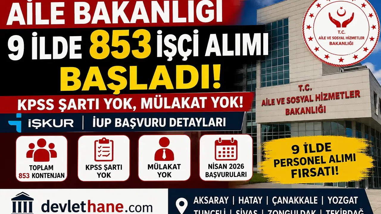 Aile ve Sosyal Hizmetler Bakanlığı personel alımı kapsamında beklenen ilan yayımlandı. İŞKUR üzerinden duyurulan İşgücü Uyum Programı (İUP) ilanlarıyla birlikte toplam 853 işçi alımı yapılacağı açıklandı. KPSS şartı aranmaması ve mülakat sürecinin bulunmaması, başvurulara olan ilgiyi artırırken, ilanlar özellikle kamu personel alımı 2026, KPSS’siz işçi alımı, İŞKUR personel alımı aramalarında üst sıralara yerleşti.