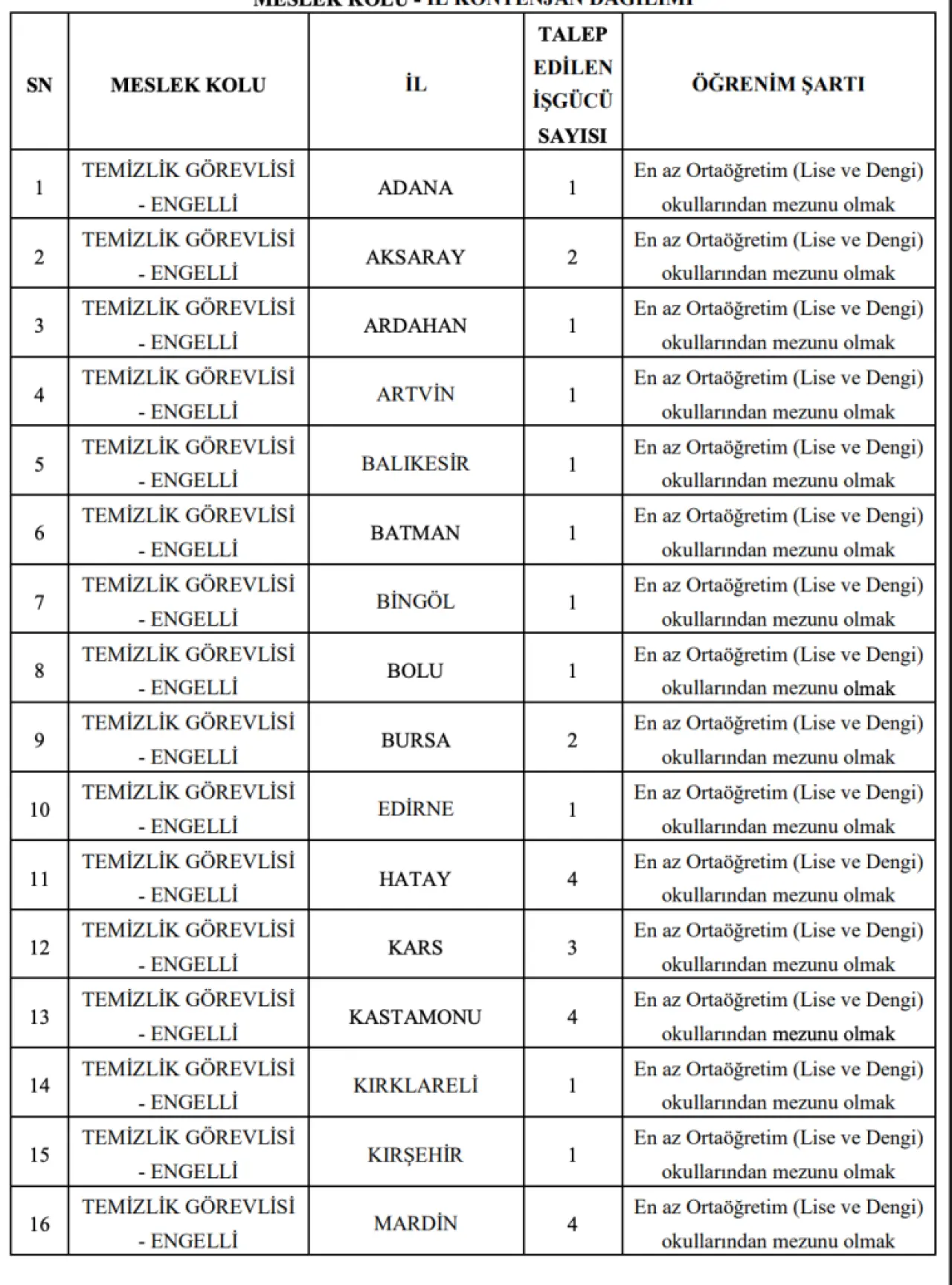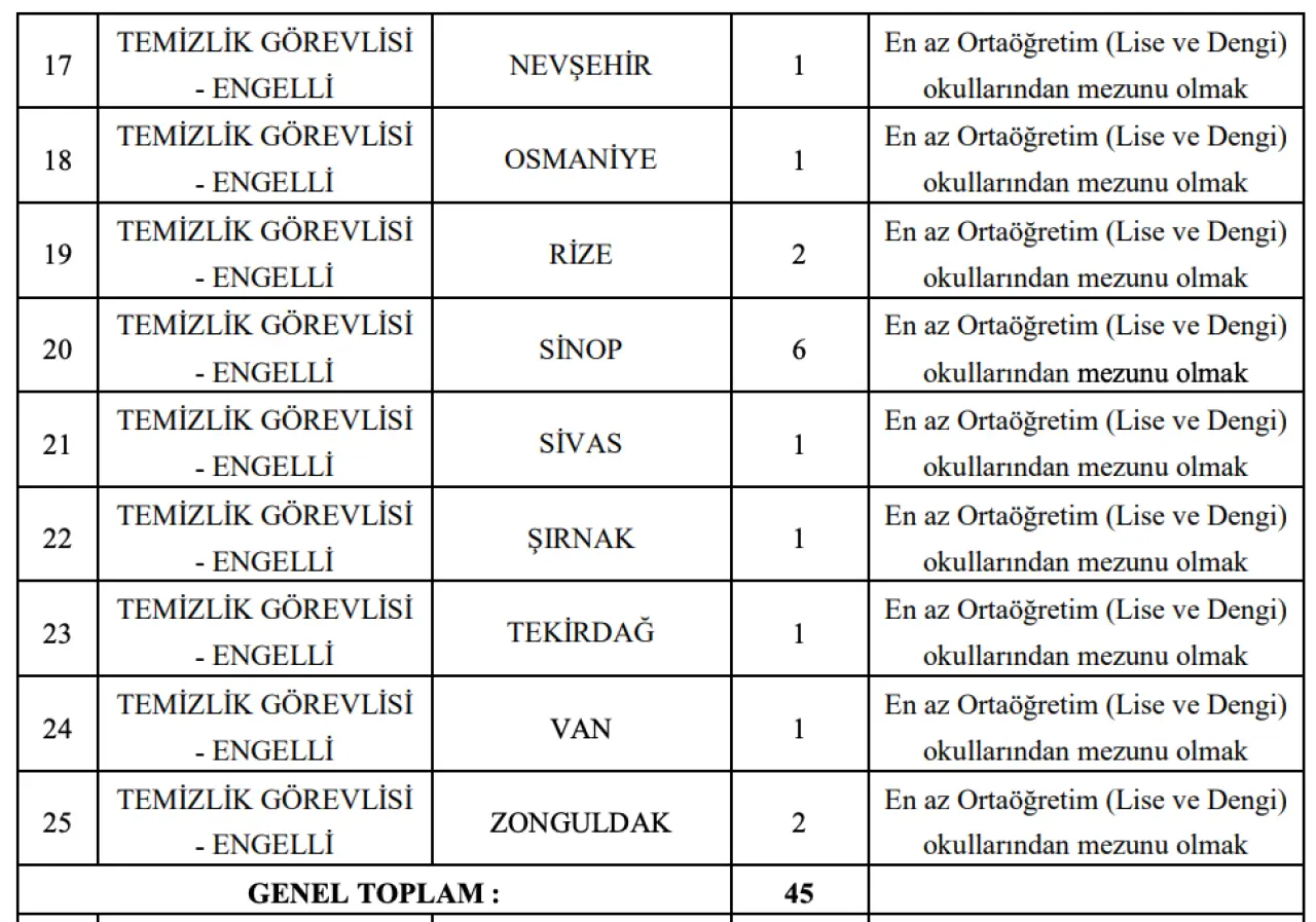 Engelli – 45 Temizlik Görevlisi: