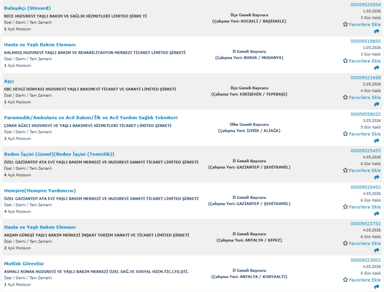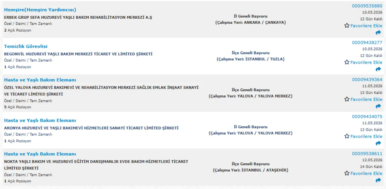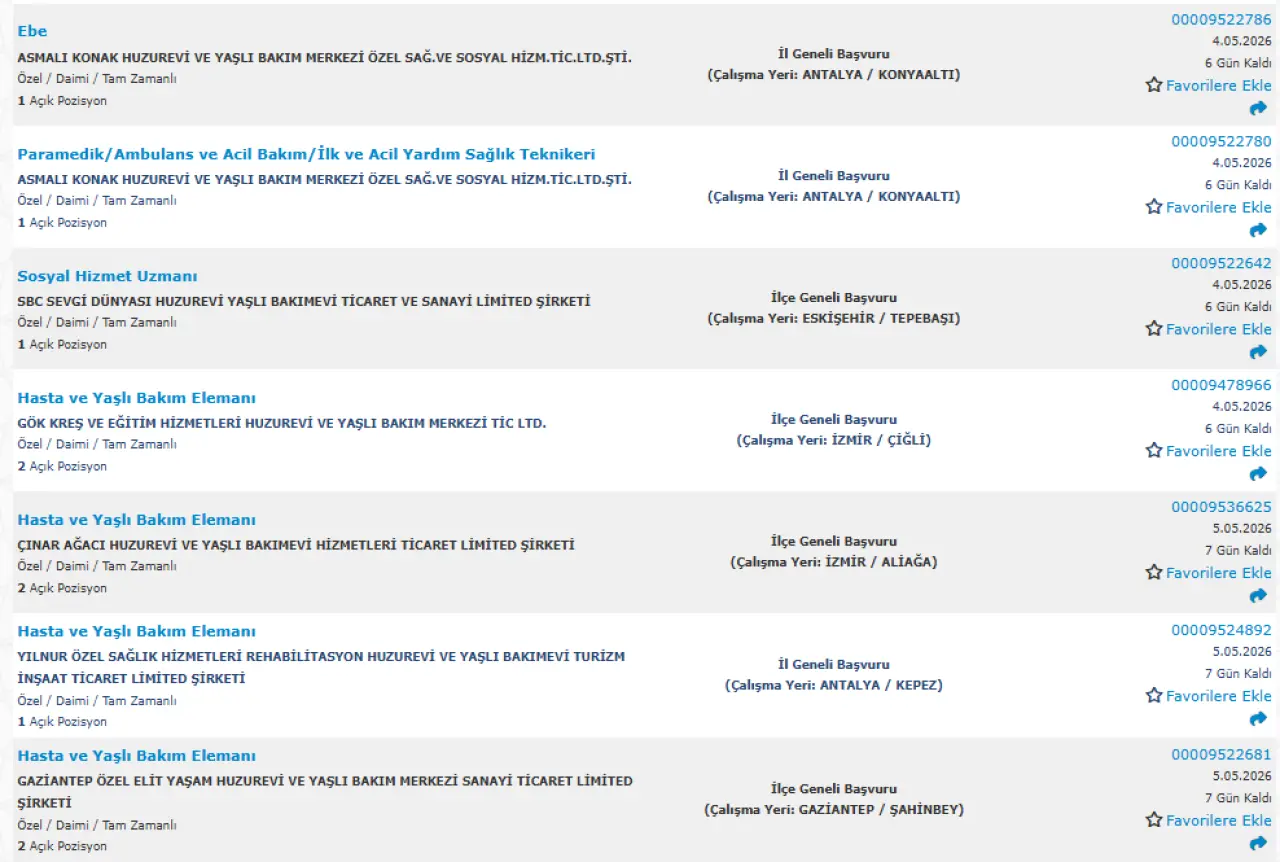 Yayımlanan ilanlara göre huzurevi ve yaşlı bakım merkezlerinde birçok farklı pozisyonda alım yapılacak. Öne çıkan kadrolar şu şekilde: