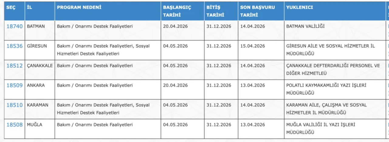 Toplum Yararına Program kapsamında açılan ilanlar incelendiğinde, özellikle Orman Genel Müdürlüğü ve bazı il valiliklerinin aktif rol aldığı görülüyor.