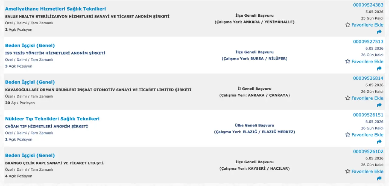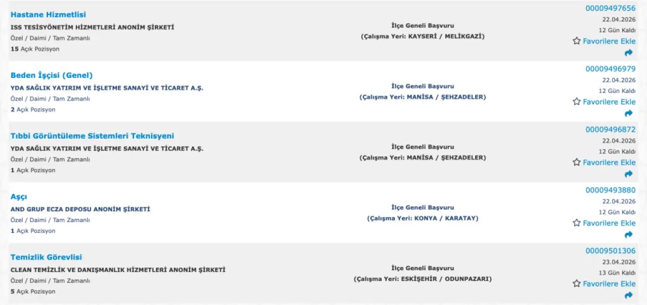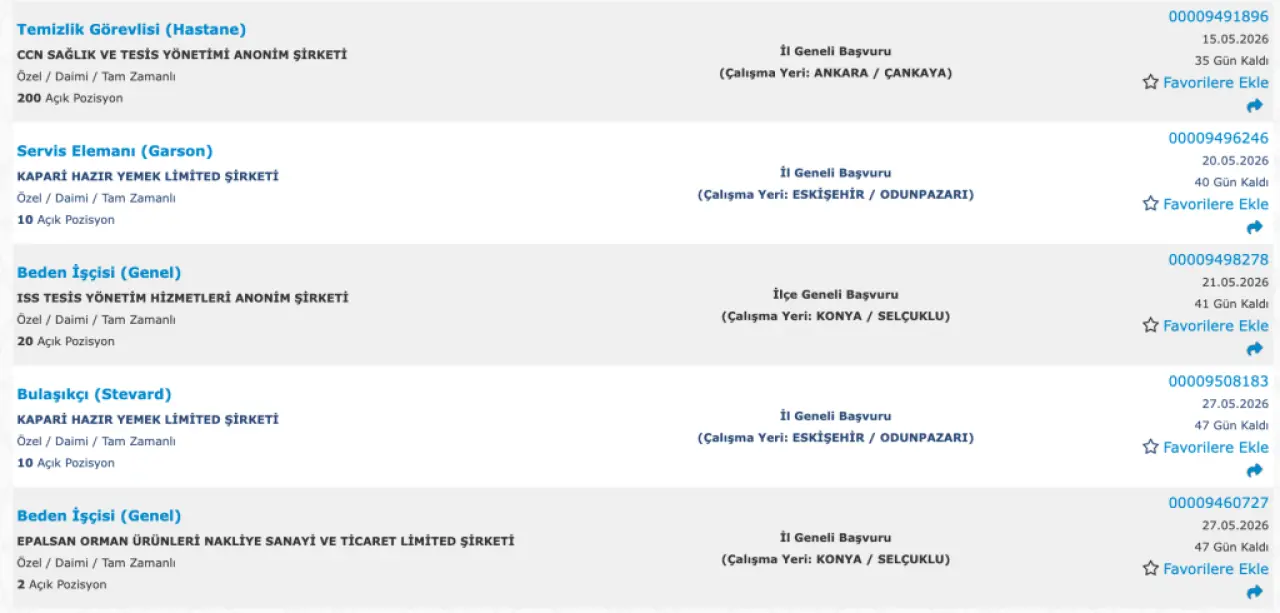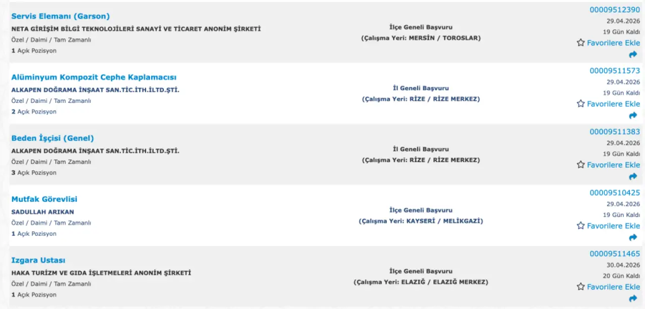 İŞKUR verilerine göre en çok alım yapılan pozisyonlar: