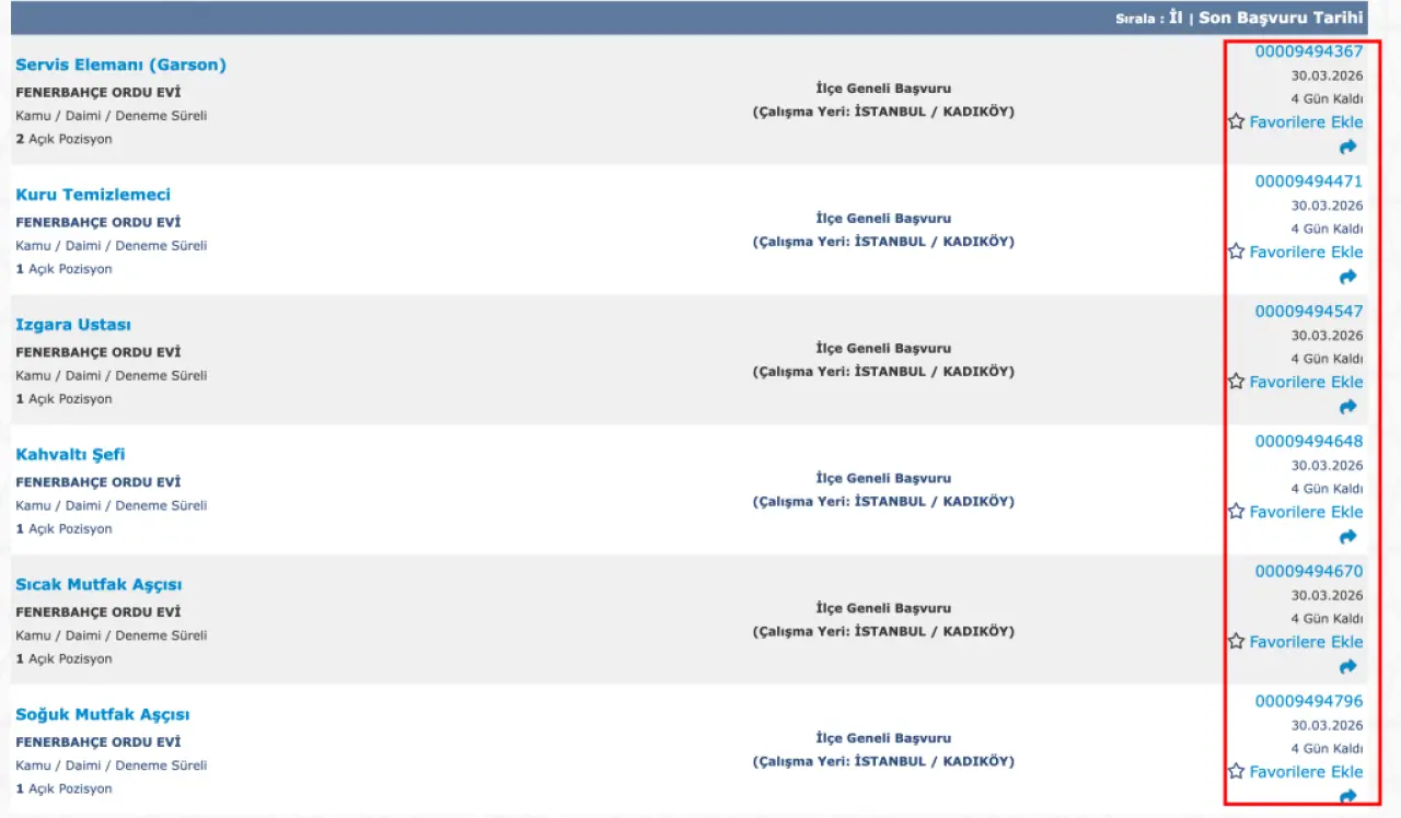 Fenerbahçe Orduevi bünyesinde yapılacak alımlar farklı meslek gruplarını kapsıyor. En dikkat çeken kadrolar servis ve mutfak alanında yoğunlaşıyor.