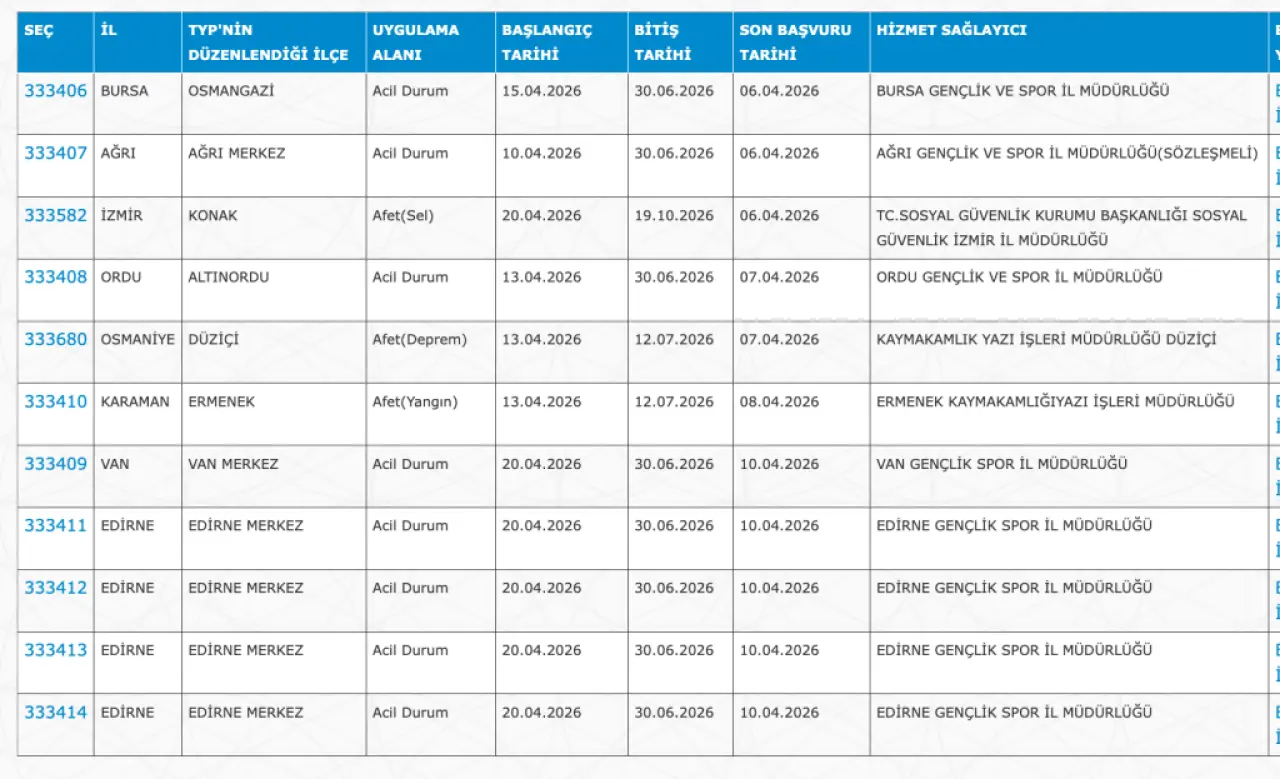 Aşağıda TYP ilanlarına ait şehir ve ilan numaraları yer alıyor: