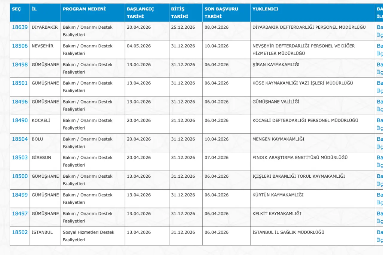 İŞKUR’un Nisan 2026 ilanlarıyla birlikte kamu kurumlarında büyük çaplı personel alımı süreci başladı. Sağlık, Gençlik ve Spor, İçişleri Bakanlığı’na bağlı birimler ile kaymakamlıklarda görevlendirilmek üzere toplam 3.134 kişi alınacak. Alımlar Toplum Yararına Program (TYP) ve İşgücü Uyum Programı (İUP) kapsamında gerçekleştirilecek. Başvuru süreleri oldukça sınırlı tutulurken, son tarihler 6 Nisan ile 10 Nisan 2026 arasında değişiyor.
