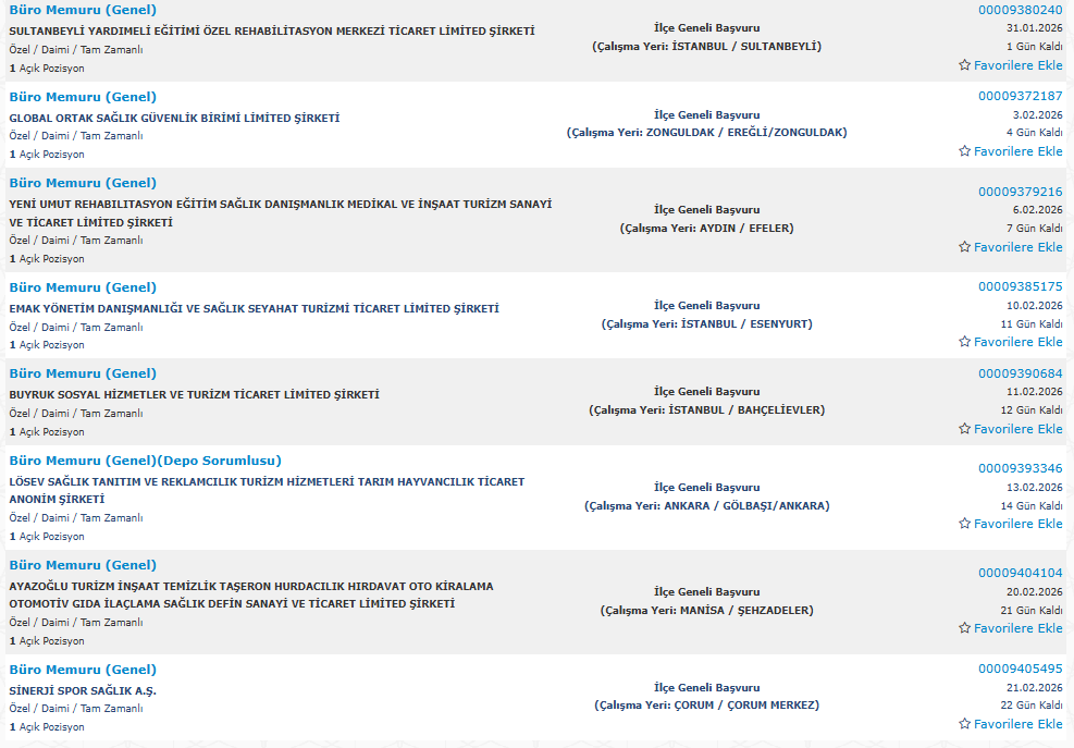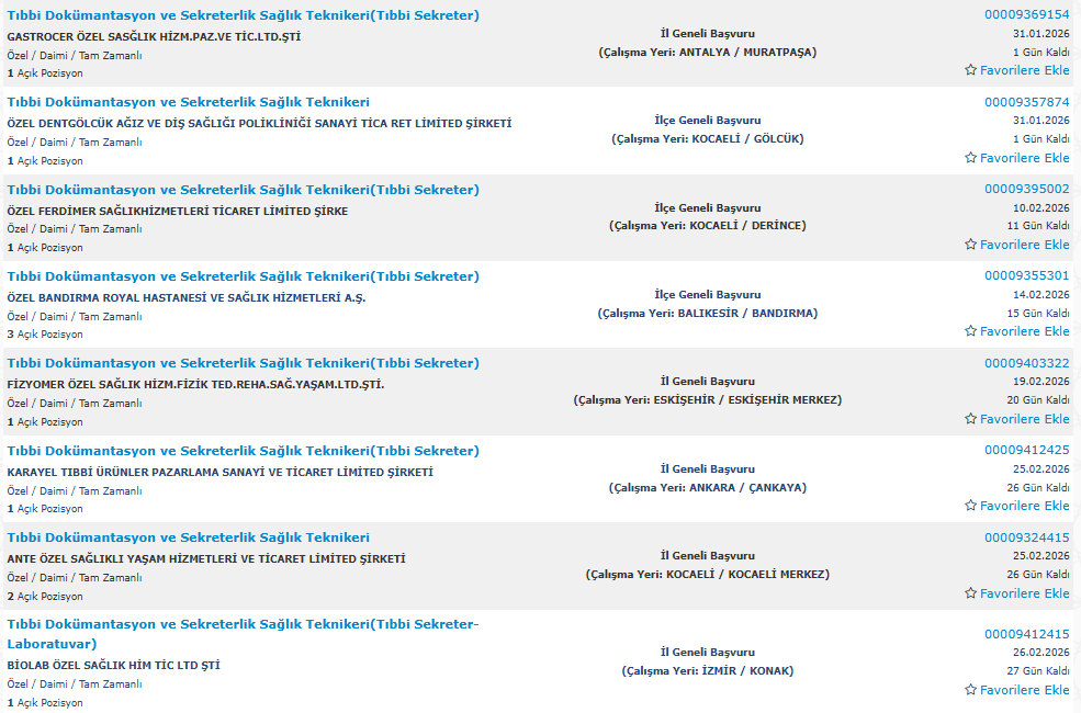 İŞKUR’un e-Şube sistemi üzerinden yayımlanan ilanlara göre; hastaneler ve sağlık kuruluşlarında görevlendirilmek üzere sekreter, büro personeli ve yardımcı ofis personeli alımları yapılacak. Alımlar, ilgili pozisyona göre tam zamanlı veya vardiyalı çalışma şeklinde olabiliyor.