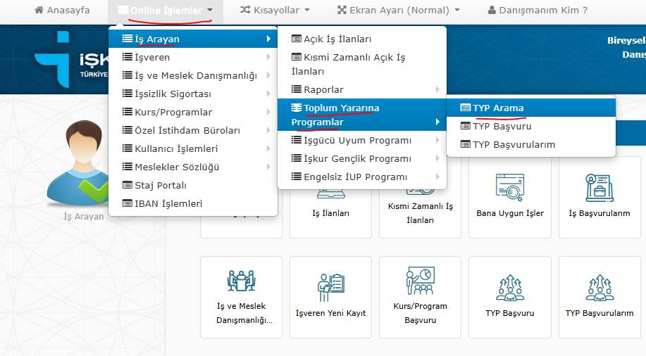 Açılan menüden sırasıyla “İş Arayan” > “Toplum Yararına Programlar” > “TYP Arama” sekmelerine tıklayın.